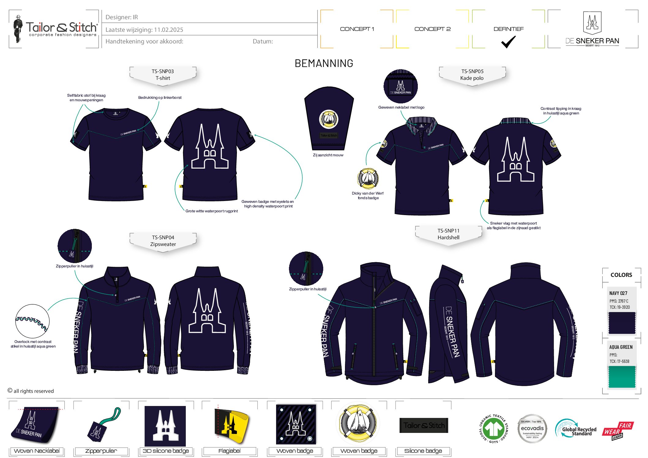 Als trots Sneker bedrijf, geworteld in het hart van Friesland, staan tradities en betrouwbaarheid centraal in alles wat we doen. Vanuit die overtuiging is Tailor & Stitch sinds 2024 trotse sponsor van het skûtsje De Sneker Pan, een samenwerking die perfect aansluit bij onze Friese roots en ambachtelijke mentaliteit. Voor dit bijzondere project kregen wij de uitdaging om een technische kledinglijn te ontwikkelen die bestand is tegen de zware omstandigheden op het water. De eisen waren helder: slijtvast, winddicht en volledig waterdicht. Na een intensief ontwikkeltraject van zes maanden presenteerden we een hoogwaardige kledinglijn die inmiddels naar volle tevredenheid wordt gedragen door de bemanning. Naast de functionele zeilkleding hebben we ook een reeks merchandise ontwikkeld. Denk hierbij aan caps, mutsen en poloshirts, waarmee supporters en liefhebbers hun verbondenheid met De Sneker Pan kunnen uitdragen.